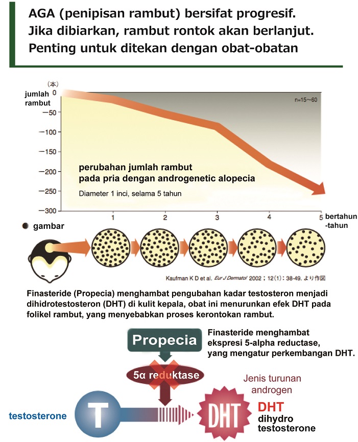 AGA (pola kebotakan pria) bersifat progresif, dan jika tidak diobati, penipisan rambut akan berlanjut. Propecia menekannya. Propecia menekan produksi DHT, mengurangi kerontokan rambut, dan memperlambat perkembangan AGA.