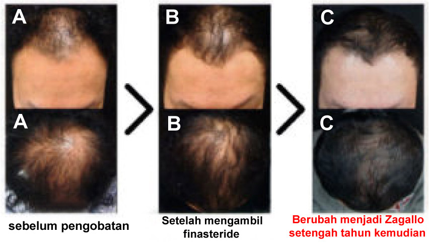 Foto B ke C adalah 24 minggu (setengah tahun) setelah beralih dari finasteride ke Zagallo, tetapi ada perubahan besar dalam efek pertumbuhan rambut.