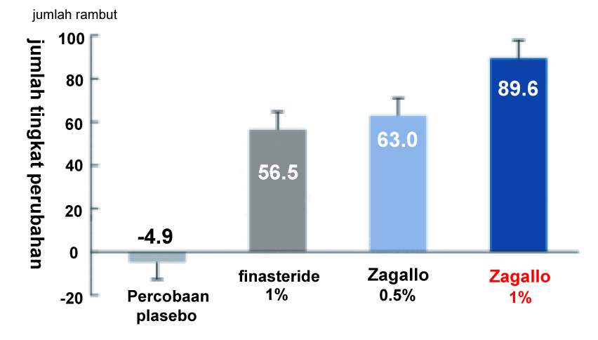 Dibandingkan dengan Propecia (Finasteride) 1 mg, Zagallo 0,5 mg secara signifikan meningkatkan ketebalan rambut * Total ketebalan rambut non-vellus dengan diameter 30 m atau lebih dalam lingkaran dengan diameter 2,54 cm pada mahkota